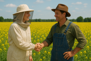 Pohdimme Oulun seudun mehiläistarhaajien ja viljelijän kesken, kuinka yhteistyömuotoinen pölytyspalvelu voisi alueella toimia.